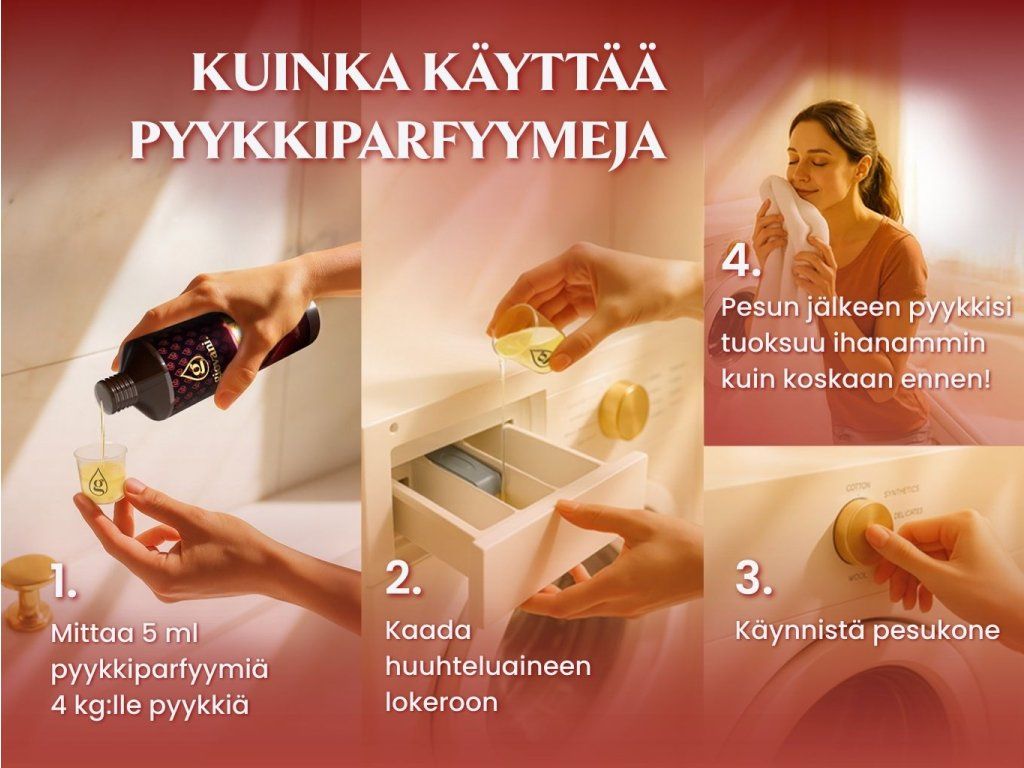 Älä laita parfyymiä pesukoneen rumpuun tai kuivausrumpuun. Ne on tarkoitettu suoraan huuhteluainelokeroon. Sinun ei tarvitse huolehtia siitä, että pyykki menettää tuoksunsa kuivausrummussa. Giovani®-parfyymit kestävät ulkoisia vaikutuksia ja ovat pitkäkestoisia. Pesty pyykki tuoksuu myös kuivausrummun käytön jälkeen. Pyykinpesuöljyjen optimaalinen säilytyslämpötila on noin 15–25 °C.